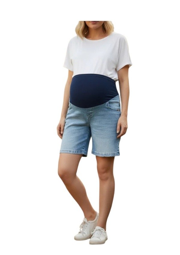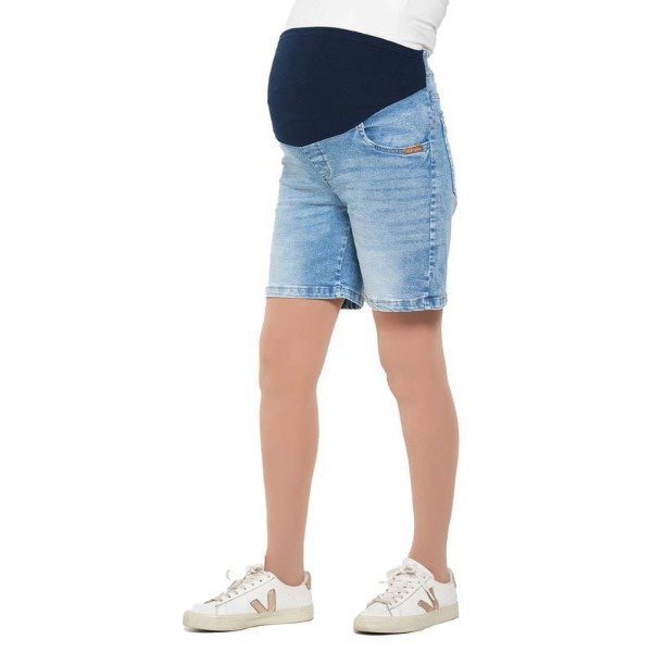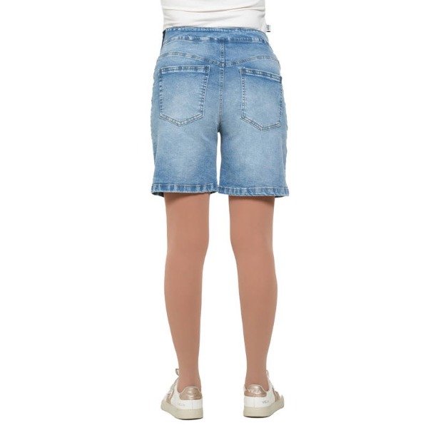 Bermuda jean elastizada. De pierna suelta. Atras cintura de un jean nornal.